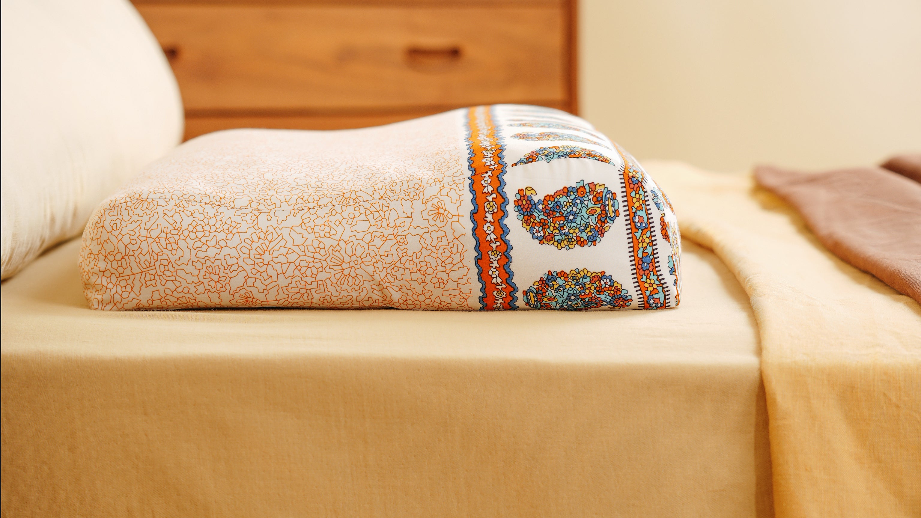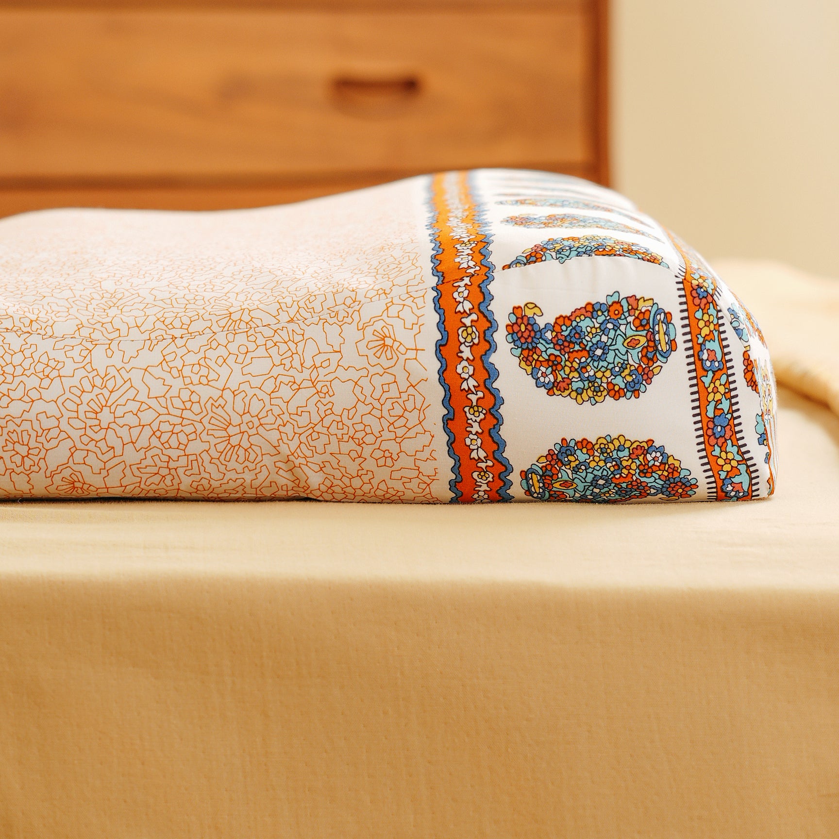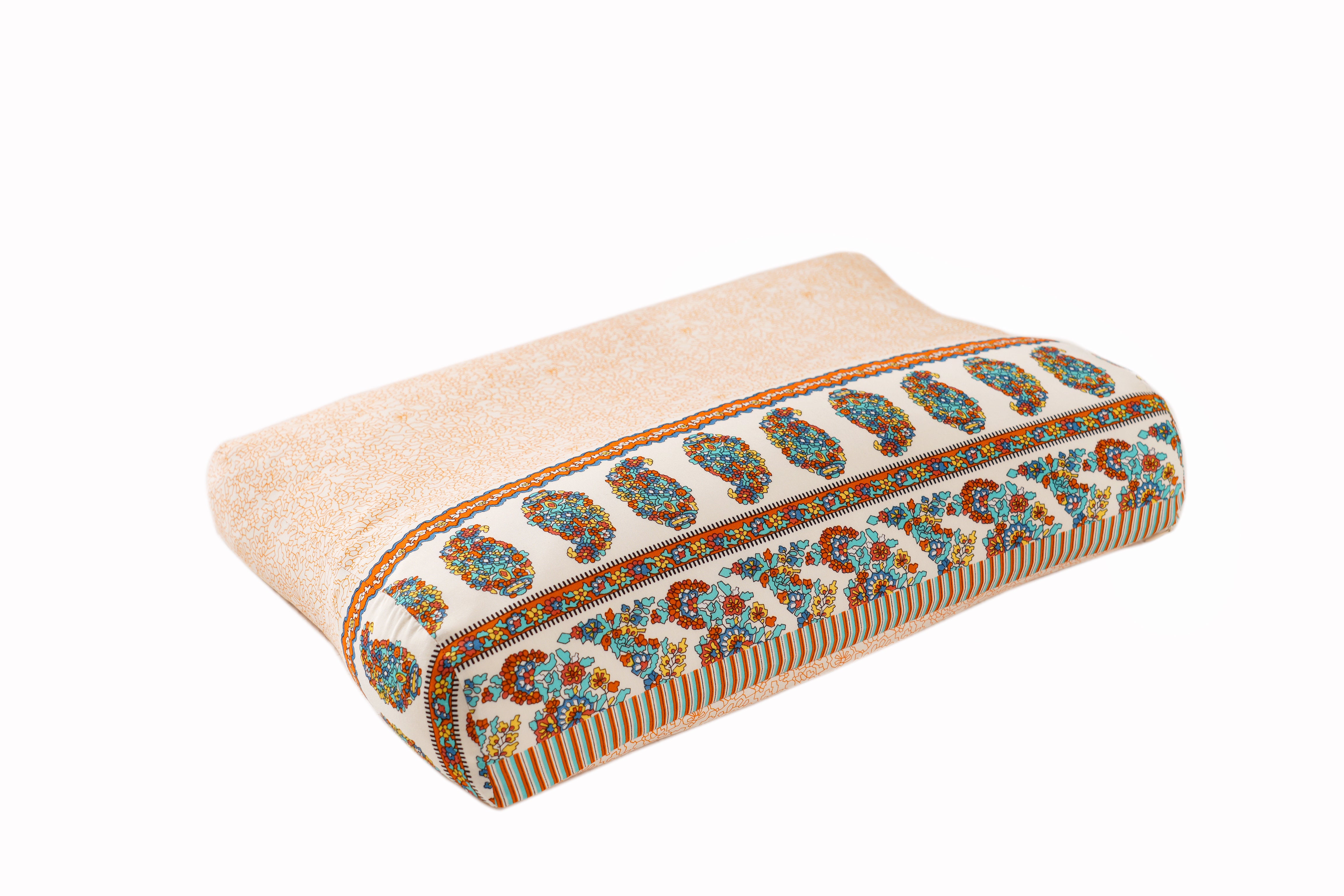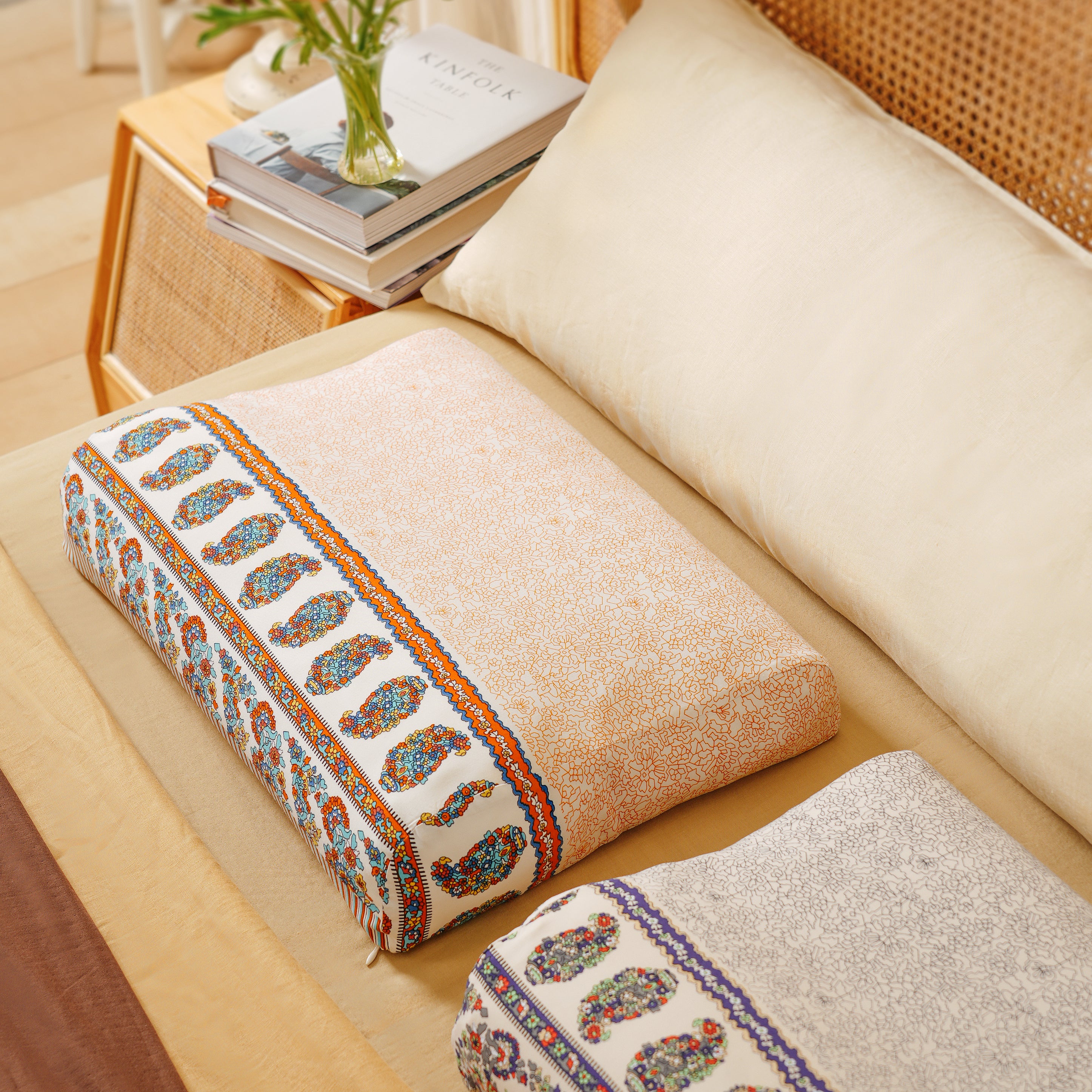 Discover the perfect balance of comfort and support with our wave-shape buckwheat pillow. Designed with high, low, and concave zones, this pillow conforms naturally to the cervical curve, relieving neck strain and promoting restful sleep. The outer cover features a vibrant yellow-orange and indigo paisley print in breathable, soft cotton. Inside, a dual-layer protective lining (pure cotton and non-woven fabric) ensures buckwheat hulls remain secure. This pillow is ideal for anyone seeking natural materials, ergonomic support, and a healthy sleep environment free from dust mites.