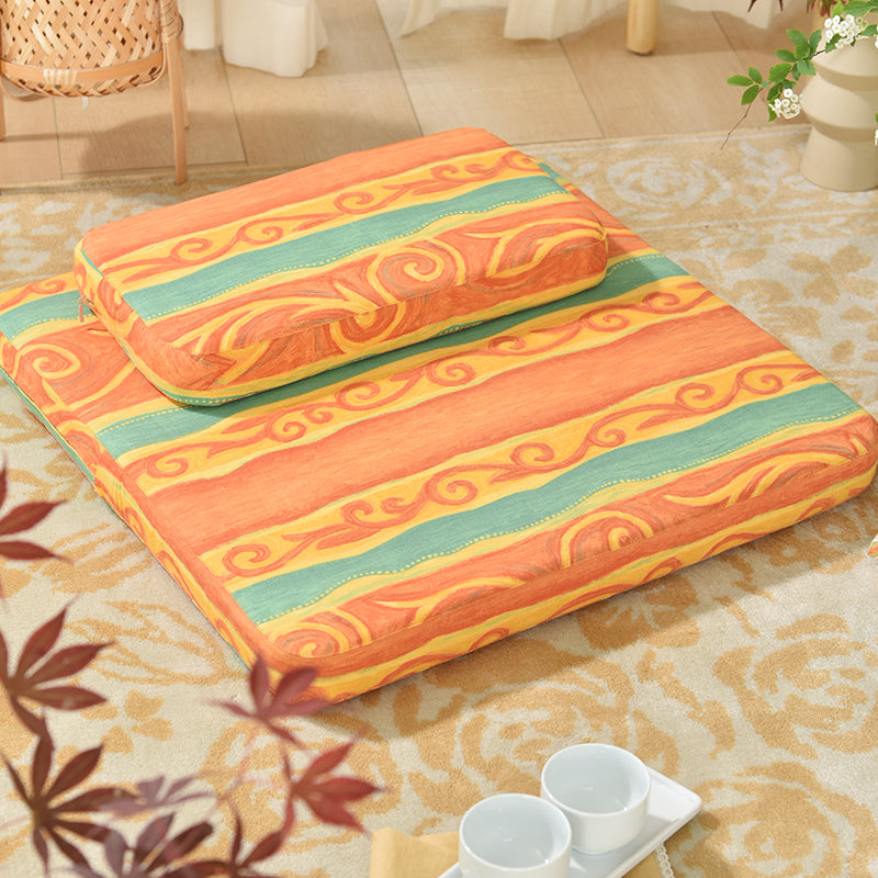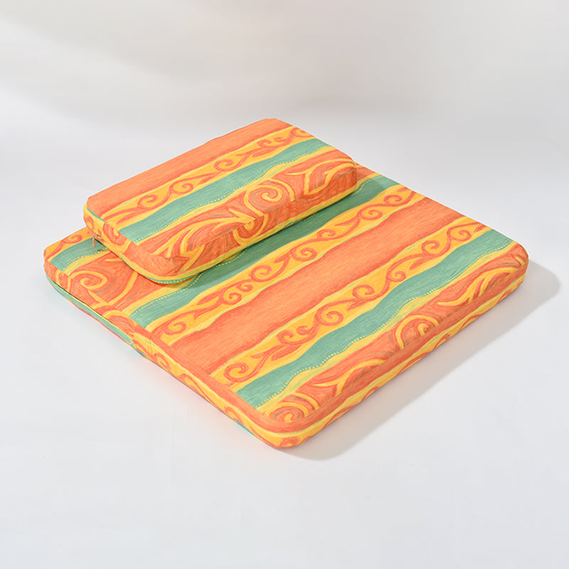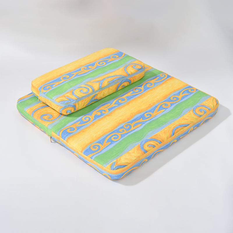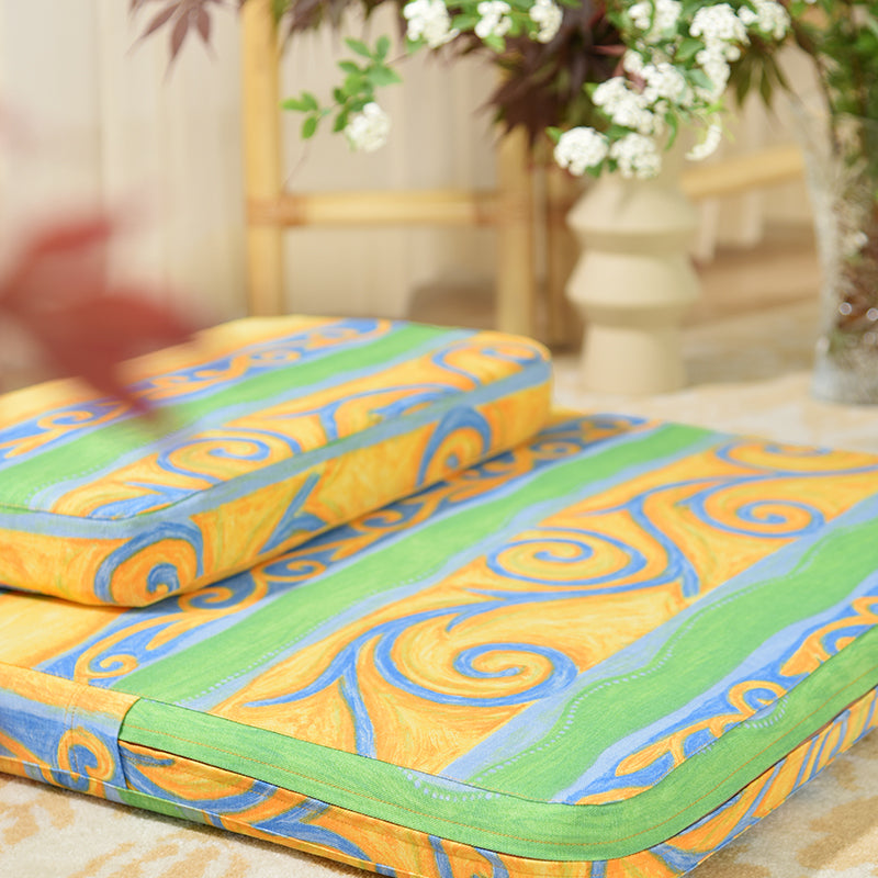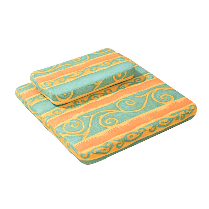 Our high-quality meditation cushion is designed for both comfort and style. This cushion breaks away from traditional, plain designs by featuring seagrass-inspired geometric patterns—adding personality to your practice. The cushion features a high-thread-count cotton cover, known for its breathability and skin-friendly properties, offering superior comfort compared to synthetic fabrics. At the core, the cushion is crafted from natural palm fiber, providing excellent elasticity and firm support. Palm fiber offers natural moisture resistance, breathability, and temperature regulation. The cover is made from high-quality 100% cotton, offering a breathable and skin-friendly surface, perfect for longer meditation sessions. What truly sets this product apart is its handcrafted construction. The palm fiber core is bordered with hand-stitched edges, a rare feature that adds durability and aesthetic value. This versatile, premium meditation cushion combines natural materials, elegant design, and handmade craftsmanship, making it an ideal choice for beginners and advanced practitioners seeking both comfort and aesthetic appeal.